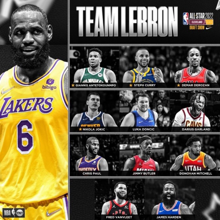 江城足球网北京时间02月11日 2022年全明星选秀,勒布朗-詹姆斯与凯文-杜兰特作为队长,在入选本次全明星赛的球员中选人组队。