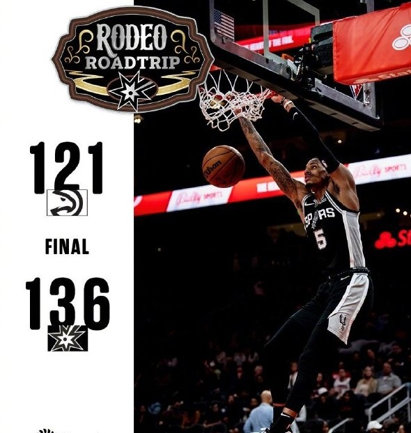 末节上来,约翰逊三分再进,博格丹三分也中作出回应,随后双方连续打铁,亨特中距离命中打破僵局,琼斯反击完成上篮,老鹰叫出暂停。调整回来,许尔特完成抛投,珀尔特尔勾手也命中,奥孔武吃饼完成暴扣,约翰逊三分再进,分差再上20分。此后两队交替取分,陷入拉锯战,特雷-杨三分再中维持悬念,马刺叫出暂停。调整回来,约翰逊上篮命中止血,随后三分再进,穆雷反击也打成,比赛基本盖棺论定,老鹰叫停换上替补,马刺随后也换人,比赛进入垃圾时间。博格丹和普里莫各中三分,老鹰连续进攻禁区打成,吉昂三分也中,稍稍追近比分,最终全场结束马刺136-121大胜老鹰。