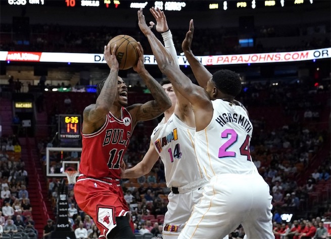 江城足球网12月21日讯 NBA常规赛,公牛客场挑战热火。公牛4连败东部倒数第五,热火4连胜东部第七。上半场,双方开场阶段短暂相持,随后公牛开始发力,多点开花将分差拉开到两位数,热火后来居上,不断冲击内线频频得手逐渐将分差反超,半场战罢热火57-52领先5分。下半场,热火命中率骤降,公牛持续发力将分差拉开到10分以上。末节热火仍无起色,公牛越战越勇不断扩大优势,热火大势已去无力回天。最终,公牛战胜热火,结束4连败的同时终结了对手的4连胜。