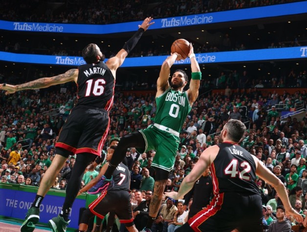 江城足球网5月26日讯 NBA季后赛东部决赛G5,凯尔特人回到主场迎战热火,上一场比赛,凯尔特人在面临绝境的情况下,塔图姆依然撑起球队进攻,其他队友也多点开花,绿军悬崖边上扳回一城,大比分追到1-3,本场比赛文森特因伤缺阵。热火上来进攻端并不流畅,还陷入3分多钟的得分荒,塔图姆则里突外投手感火热,加上其余队友外线多点开花,绿军打出20-5的梦幻开局,随后怀特也接连扔进三分,绿军牢牢掌握主动权,次节邓罗率领替补席帮助热火追分,但杰伦-布朗也发力给出回应,热火接连出现失误,绿军依靠首发五虎的强势表现一度拉开20分以上分差。下半场,双方展开拉锯战,热火始解决不了失误问题,凯尔特人继续多点开花掌握住近20分的领先,末节热火早早换上巴特勒等主力,但绿军全主力非常谨慎,双方命中率都有下降,但凯尔特人还是牢牢保持住十几分领先,最终凯尔特人轻取热火,大比分扳成2-3。