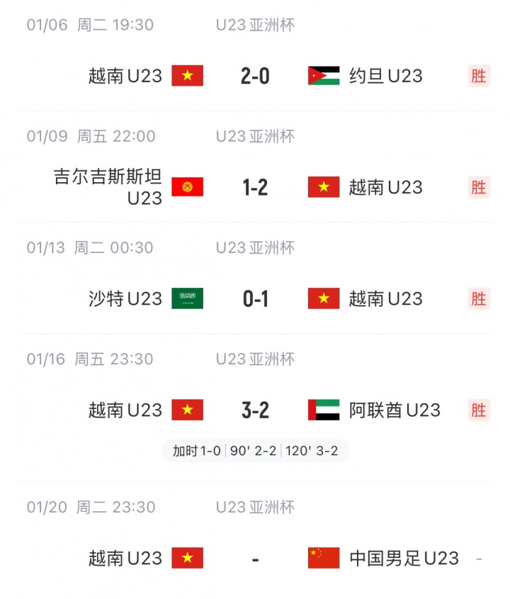 不过,中国U23的进攻火力也为越南U23带来了乐观情绪:他们在4场比赛中仅打入1球。而越南队从小组赛到四分之一决赛遇到的对手实力强劲。小组赛中,越南队打入5球,仅失1球。四分之一决赛,越南队打入3球,失2球。
