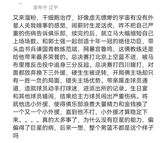 最后,我们再来说说近期辽宁男篮球迷对于郭艾伦的手撕,近期,有球迷在社交媒体上发表了长文,控诉了郭艾伦的四宗罪,比如说隐瞒伤病+逼走两个恩师,该球迷在社交媒体上对于郭艾伦是进行了口诛笔伐,而从其IP来看,这应该是个辽宁球迷,所以也很难让人理解为什么辽宁男篮球迷会对于郭艾伦有如此大的怨气呢?