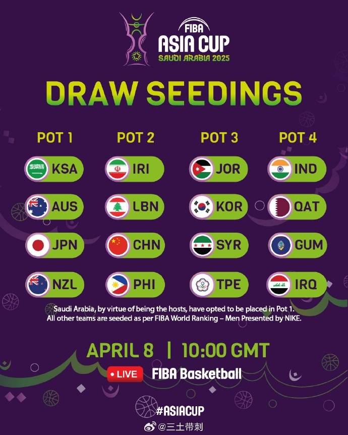 江城足球网 4月5日,男篮亚洲杯签分档出炉。根据最新的世界排名来分档,中国男篮排名亚洲第六,列入第二档。