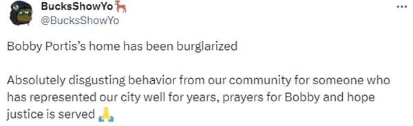 波蒂斯为雄鹿比赛期间家中被盗引热议,美媒表示他为密尔沃基贡献了一切,他的家中被盗太令人心碎了;雄鹿球迷表示:我们社区对多年来一直代表我们城市的人做出如此令人厌恶的行为,为鲍比祈祷,希望正义得到伸张。