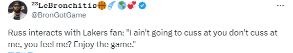 江城足球网讯北京时间11月25日,威少笑对骂声一幕曝光,被骂滚出去之后,威少微微一笑并且送飞吻,之后威少找到这位湖人球迷,直言:我不会骂你你也别骂我。