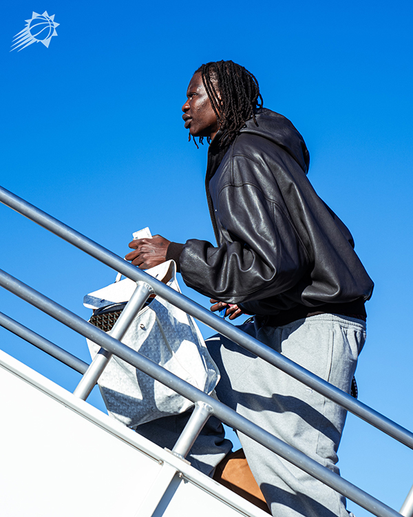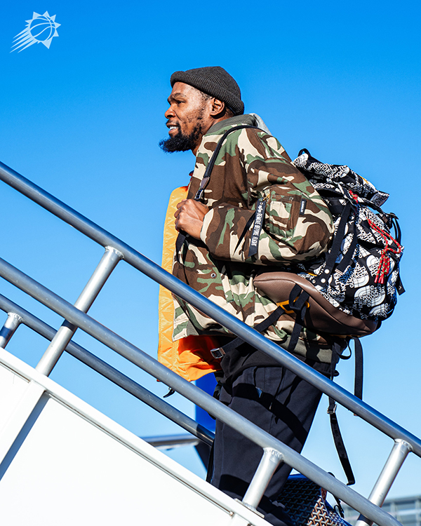 太阳众将登机飞往犹他,杜兰特身穿迷彩服外套、戴着小黑帽以及背着双肩包,把自己包裹地很严实;布克身穿短裤和短袖,开着自己的豪车来到机场,还带着自己的宠物狗;比尔则是带着很多行李,不仅背着双肩包,而且提着一个大包。