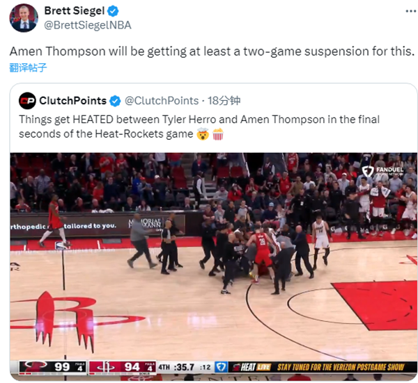 火箭和热火爆发大规模冲突引热议,多位名记表示两队将有多名球员被停薪禁赛,Brett Siegel表示阿门-汤普森至少将被禁赛两场。