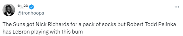 理查兹太阳首秀21+11引热议,他完美适配杜兰特和布克,让太阳打得更有活力,可湖人躺枪,美球迷表示太阳用一包袜子换来了理查兹,佩林卡却让詹姆斯和海斯这个混蛋一起打球,还有球迷表示佩林卡一直在用糟糕的双向签约来省钱,而不是得到一个真正优秀的中锋。
