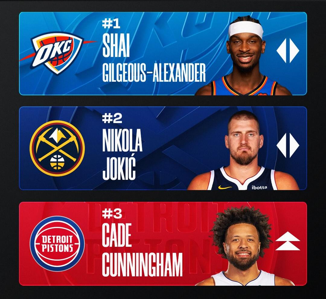 上期链接>>>官网MVP榜:SGA约基奇前2 坎宁安升第3 文班升第4 东契奇跌至第5