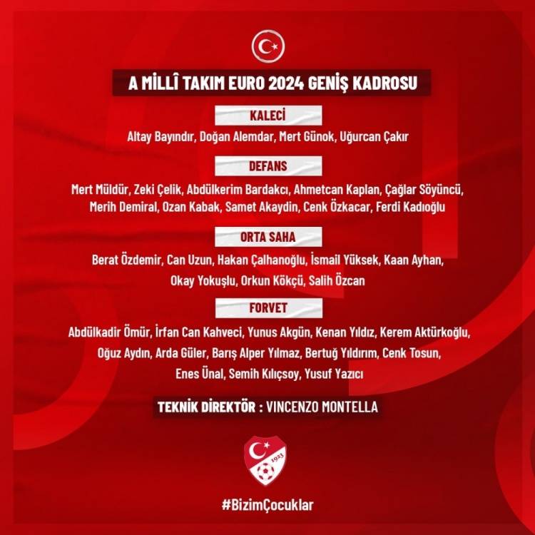 江城足球网北京时间5月25日消息,土耳其国家队公布了今夏欧洲杯的35人初选名单。在欧洲杯之前,土耳其将与卫冕冠军意大利和波兰进行两场热身赛。