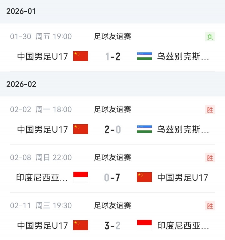 日前U17国足组织了今年的第一期集训,与乌兹别克斯坦U17和印尼U17分别进行了2场比赛,取得3胜1负的战绩。