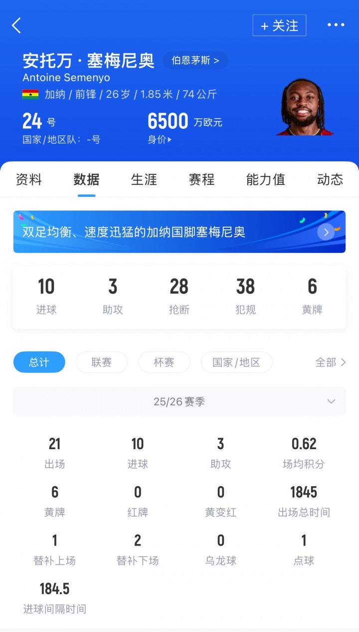 塞梅尼奥加盟伯恩茅斯至今4个赛季,已代表球队出战110场贡献32球13助。本赛季,塞梅尼奥各赛事21场10球3助。